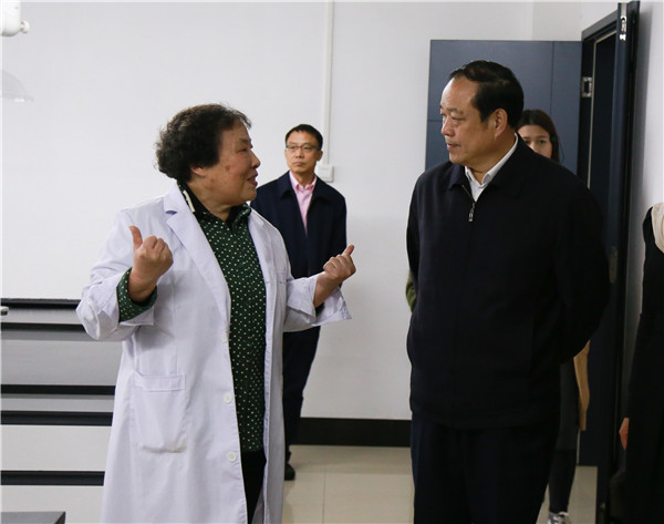 环生实验教学中心负责人吴士筠(左)向刘传铁厅长(右)介绍实验室情况 摄影:王晨杲