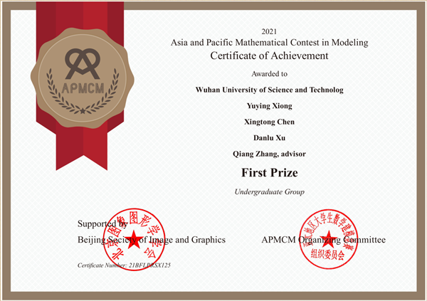 武科大网讯 近日,2022年第十一届亚太地区大学生数学建模竞赛(APMCM)获奖名单公布。武汉科技大学获一等奖2项、二等奖9项、三等奖26项,国级奖项共计37项。武汉科技大学2019级本科统计专业熊玉英、陈星彤和软产专业徐丹璐荣获一等奖,张强老师荣获“优秀指导教师奖”,武汉科技大学荣获“优秀组织单位奖”。
