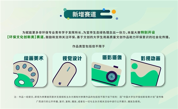 为了多维度激励大学生的环保创新热情,让更多青年学子能在擅长和热爱的领域挥洒创意、助力环保,本届“培育计划”对赛道规划进行了创新升级。环保文创产品兼具文化、艺术与情感价值,容易引发公众共鸣,是环保理念传播的重要载体。为此,大赛特别增设“环保文化创新类”赛道,鼓励大学生围绕环保主题设计文化创意作品,传递推广环保理念,包括但不限于绘画美术、摄影摄像、视觉设计、影视动画等形式。优秀作品将被用于丰富平台未来环保公益活动内容,为环保公益事业切实献力。