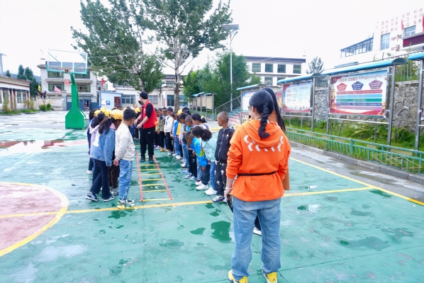 图为关爱队师生志愿者带康雄乡中心小学学生上素质拓展课 摄影:杨小婷