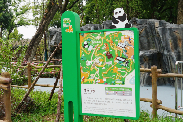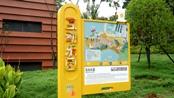 徐郑冰率团队设计的标识系统也特色鲜明,该系统采用正负形的设计手法,从不同的动物形态上提取造型,将动物园多种动物明星巧妙的融在一个平面空间里,让形体和空间相辅相成、彼此衬托。不仅如此,设计团队还采用“字绘”的手法来创作各区域的名称,以细节丰富、色彩鲜亮的动物插画填充汉字,“字绘”出了“神秘美洲”“多彩亚洲”“树上王国”“熊猫竹海”等名称。