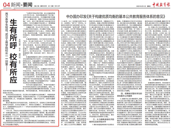 图为《两万条学生短信,必赢优惠y272net校长一一回复——生有所呼 校有所应》登上《中国教育报》