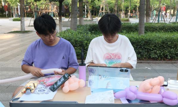 “原汁原味的内蒙古牛肉干奶茶”“纯手工流麻同学要不要来体验一下”......市集开始后,叫卖声此起彼伏,市集上内蒙特产美食、书法作品、明信片、花式气球、棉袜等商品琳琅满目,价格从3元到200元不等。活动现场人流涌动,吸引了不少同学前来“赶集”。