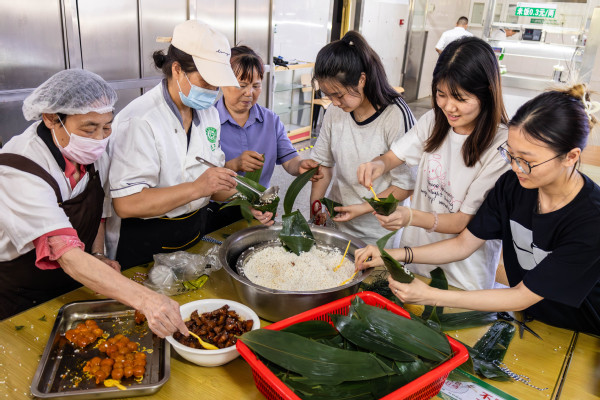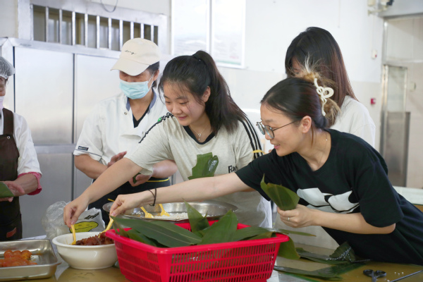 图为食堂员工和学生一起开心包粽子 摄影:刘皓辰 余剑韬 熊昱淞 芮雨欣