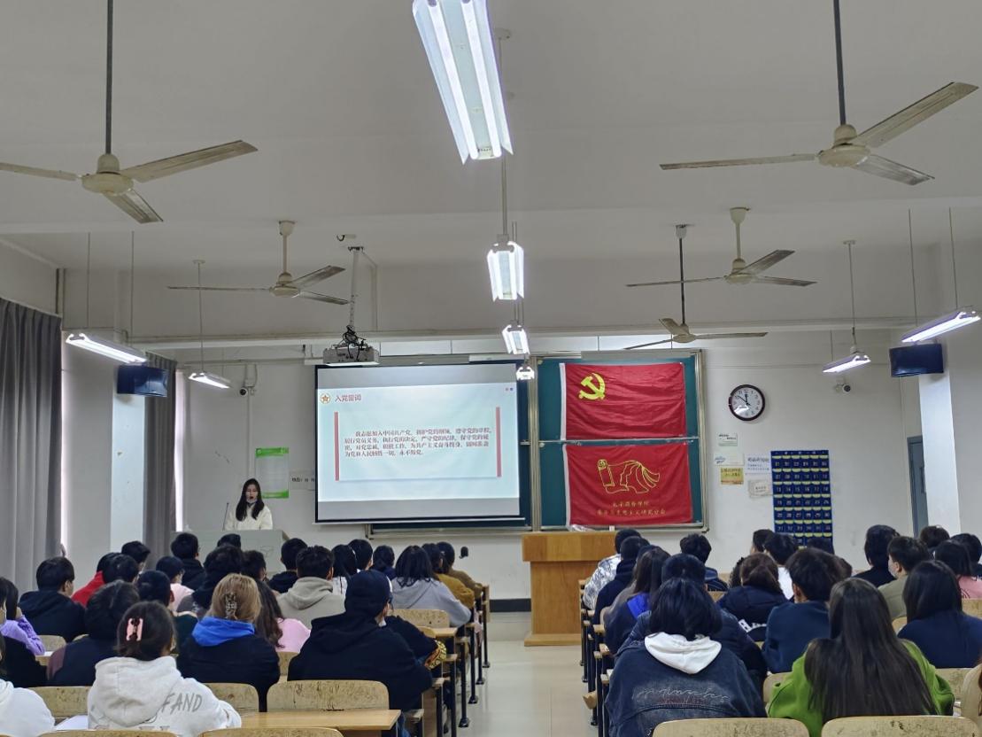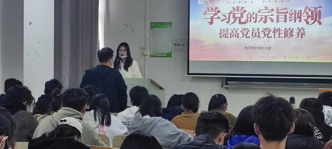 20221118日星期五中午1230,在综合楼401教室举行第十三期党校培训班第三讲,电子商务学院朱懿老师带领党校同学们深入了解共产党的宗旨、纲领,科学理论武装头脑夯实根基,提高党性修养。