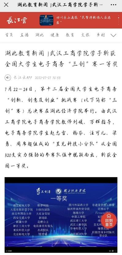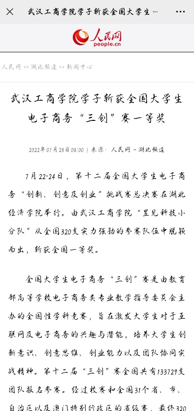 荣获第十二届全国大学生电子商务“创新、创意、创业”挑战赛国家一等奖,并荣幸被人民网和湖北将于新闻所报。