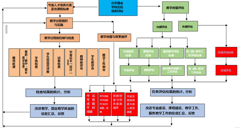 各专业要建立本科人才培养质量自评制度,对本专业教学质量状态进行诊断,对生源、就业、师资、教学设施、培养方案、毕业论文(设计)、实践能力和创新创业能力培养等进行总结与分析,对在校学生学习成效及培养目标达成情况进行评价,对毕业生进行持续跟踪调查,充分听取校内外专家关于专业发展的建议和意见。学院应根据各专业自评情况,不定期组织校内外专家检查指导,提出下一阶段持续改进的建议和意见。