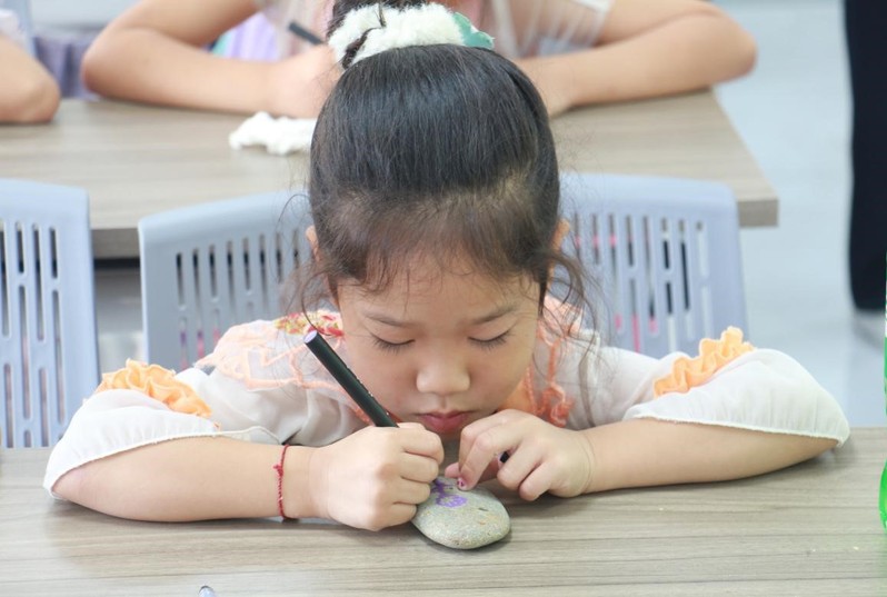 孩子们在志愿者的指导下,全情投入创作:有的屏息凝神勾勒线条,有的大胆尝试配色,有的兴奋地交流灵感。石头在孩子们的手中瞬间焕发生机:可爱的小兔子、家乡风景、神秘的海底世界、还有动画片中的动漫人物,栩栩如生地跃然石上。颜色在石头上绽放,不仅描绘出童真的图案,更展现了孩子们专注的神情和无边的想象力。这堂生动有趣的艺术实践课,不仅让孩子们体验到亲手创造的成就感,更是在他们心中悄然播撒下发现美、创造美的种子,让艺术在指尖流淌,让梦想在方寸间起航。