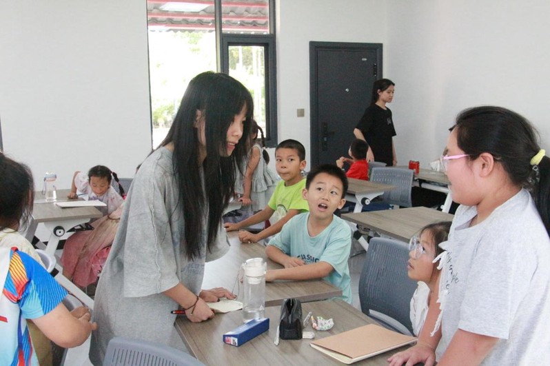 图为志愿者为小朋友们讲解如何绘画 摄影:郭怡含