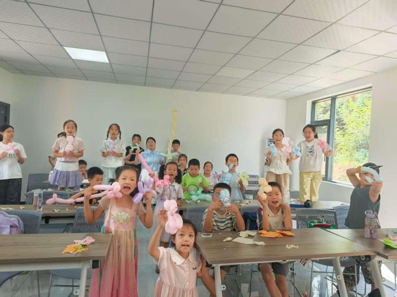 除植物拓印外,当日课程还设置了手工气球编织与折纸活动。在手工气球环节,志愿者教授了单泡结、双泡结等基础技法,孩子们发挥想象力用彩色气球制作出小狗、花朵等形态各异的气球造型,并开展“气球展示会”,现场充满“噗噗”的吹气声与欢笑声。折纸课上,志愿者以“青蛙”与“纸杯”为范例,引导孩子们通过折叠、剪裁创作出立体作品。