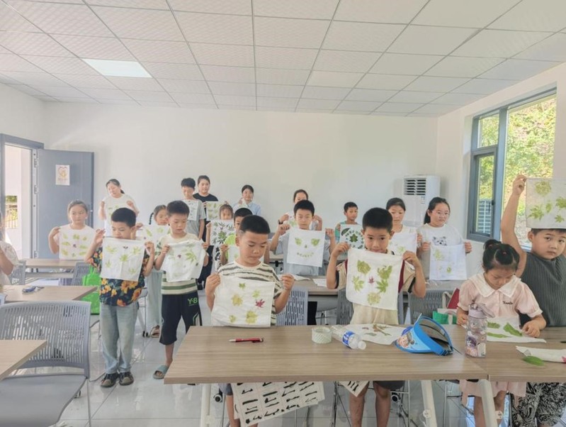 植物拓印课堂上,志愿者以谢店村特色植物为创作媒介,带领孩子们开启了一场“敲敲”留下的自然美学之旅。志愿者提前采集了村内随处可见的枫叶、银杏片,以及蕨类、鸡爪槭等本土植物,通过“清洗浸泡—排列设计—胶带固定—敲击拓印—固色处理”五步教学法,引导孩子们将植物形态永久定格在棉布上。孩子们以“谢店村植物地图”为主题,用锤子轻轻敲击,让叶脉纹理在棉布上清晰呈现,最终创作出融合本地植物元素的拓印作品。志愿者还讲解了植物拓印的历史渊源,让孩子们在动手实践中理解这一非遗技艺的文化价值