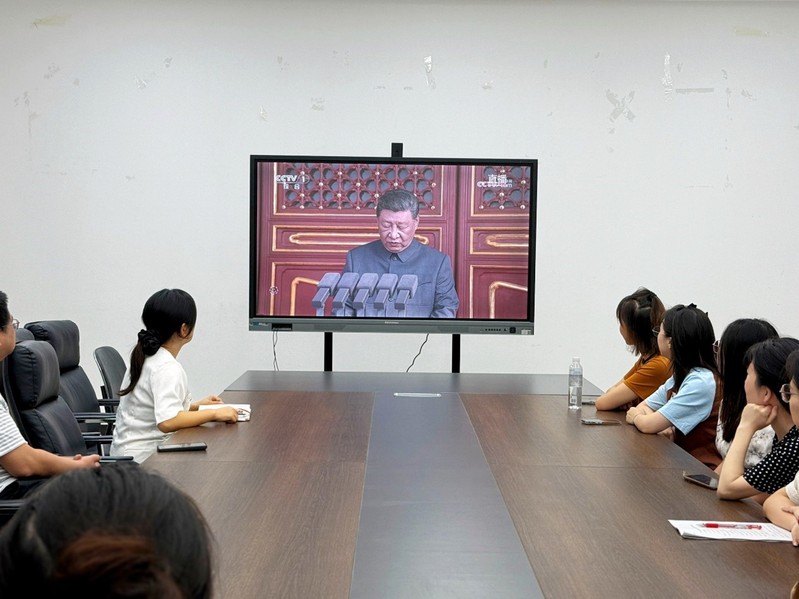 分团委宣传部讯(记者:胡紫晴)2025年9月3日上午,中国人民抗日战争暨世界反战争胜利80周年纪念大会在北京天安门广场隆重举行。电子商务学院组织全体师生和团支部成员集中观看阅兵仪式直播,共同见证这一庄严的历史时刻。