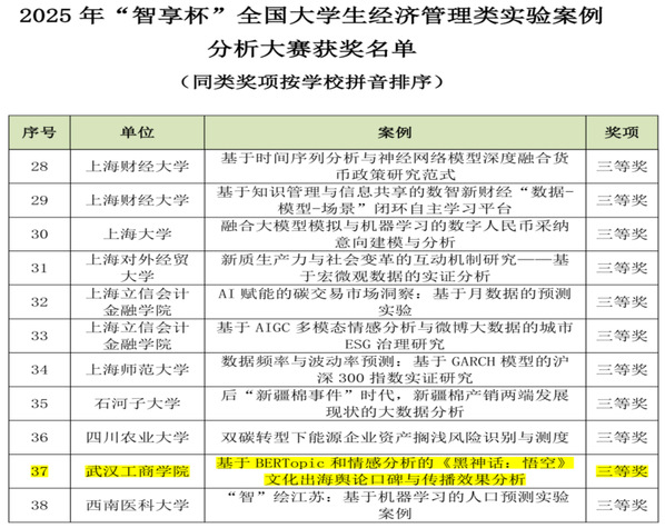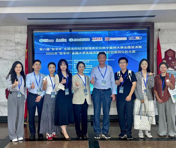 新闻中心讯(记者 张恒)11月1日,由高等学校国家级实验教学示范中心联席会经济与管理学科组、全国高校财经慕课联盟主办,厦门大学经济学院、厦门大学大学王亚南经济研究院、厦门大学邹至庄经济研究院承办的2025年“智享杯”全国大学生经济管理类实验案例分析大赛落下帷幕。我院学生与全国149支队伍角逐通过网评入围全国总决赛,现场同43支队伍同台竞技,最终我院24级大数据专业学生陶钰楠、毛江涛、冯奕辉荣获“全国三等奖”佳绩。