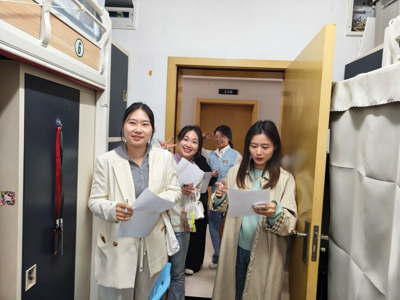 图为刘丹丹老师,朱懿老师及分团委学代表参观寝室并进行评估 摄影:张凌月