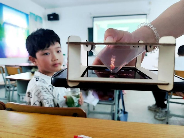 简易全息投影装置穿过每一个孩子之间,孩子们好奇地围拢,弯腰从特定角度观看。装置上方,一个清晰的哪吒3D立体影像,仿佛悬浮空中,孩子们伸出手指,脸上满是惊奇与专注。