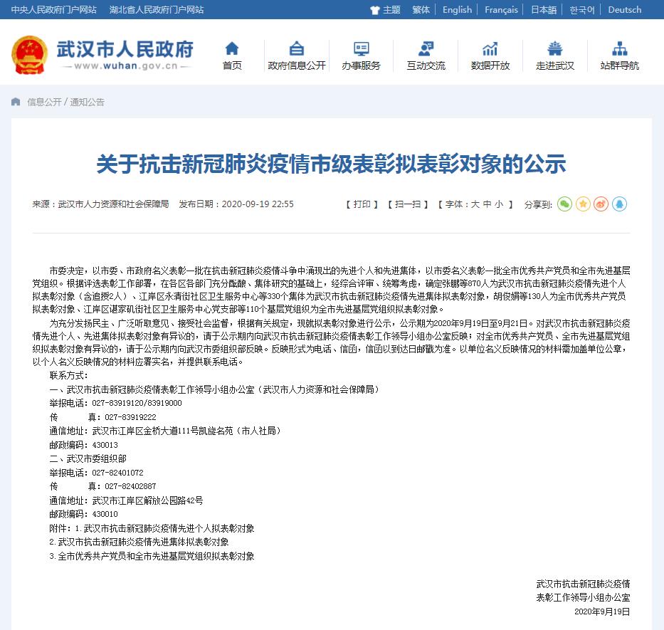 9月19日,武汉市抗击新冠肺炎疫情表彰工作领导小组办公室发布关于抗击新冠肺炎疫情市级表彰拟表彰对象的公示:市委决定,以市委、市政府名义表彰一批在抗击新冠肺炎疫情斗争中涌现出的先进个人和先进集体,以市委名义表彰一批全市优秀共产党员和全市先进基层党组织。根据评选表彰工作部署,在各区各部门充分酝酿、集体研究的基础上,经综合评审、统筹考虑,确定张鹏等870人为武汉市抗击新冠肺炎疫情先进个人拟表彰对象(含追授2人)、江岸区永清街社区卫生服务中心等330个集体为武汉市抗击新冠肺炎疫情先进集体拟表彰对象,胡俊娟等130人为全市优秀共产党员拟表彰对象、江岸区谌家矶街社区卫生服务中心党支部等110个基层党组织为全市先进基层党组织拟表彰对象。