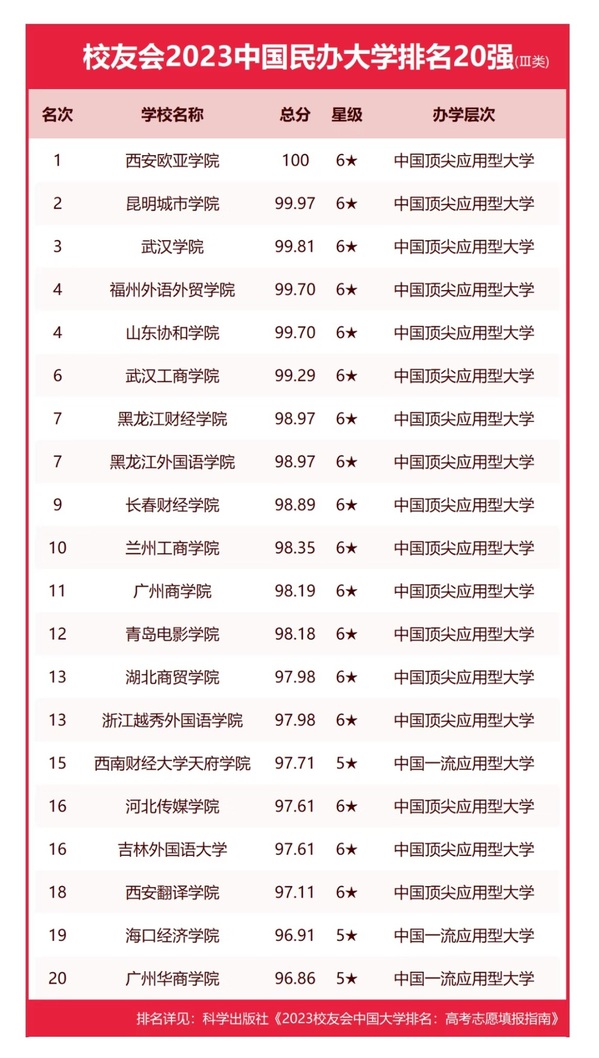 新闻中心讯(记者李洋洋)4月6日,艾瑞深校友会网正式发布《2023校友会中国大学排名——高考志愿填报指南》,其中,在2023中国财经类民办大学排行榜中,必赢优惠y272net位列第三,在2023中国民办大学相关排行榜中,必赢优惠y272net位列第六,荣膺2023中国六星级民办大学,办学层次为中国顶尖应用型大学,学校的综合办学实力、人才培养水平与社会声誉逐年攀升。