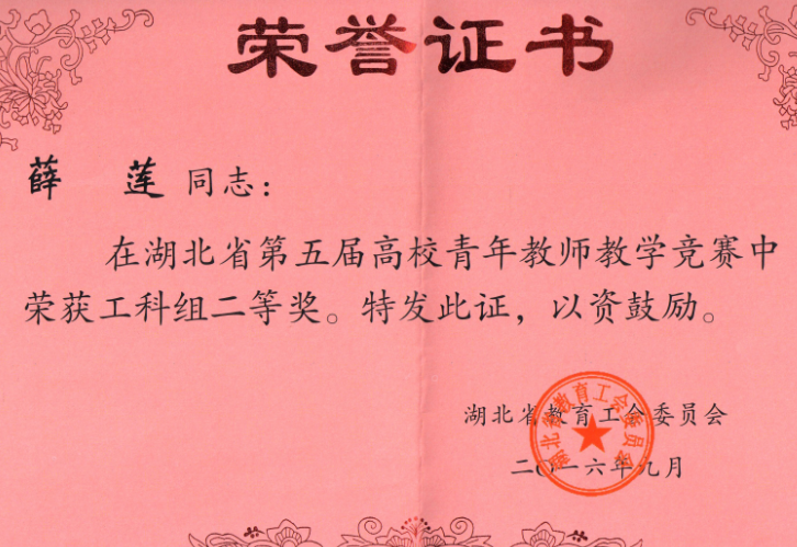 薛莲老师获得荣誉证书