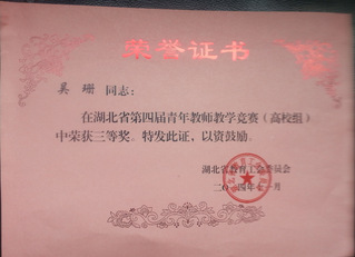 吴珊荣获湖北省第四届高校青年教师教学比赛三等奖