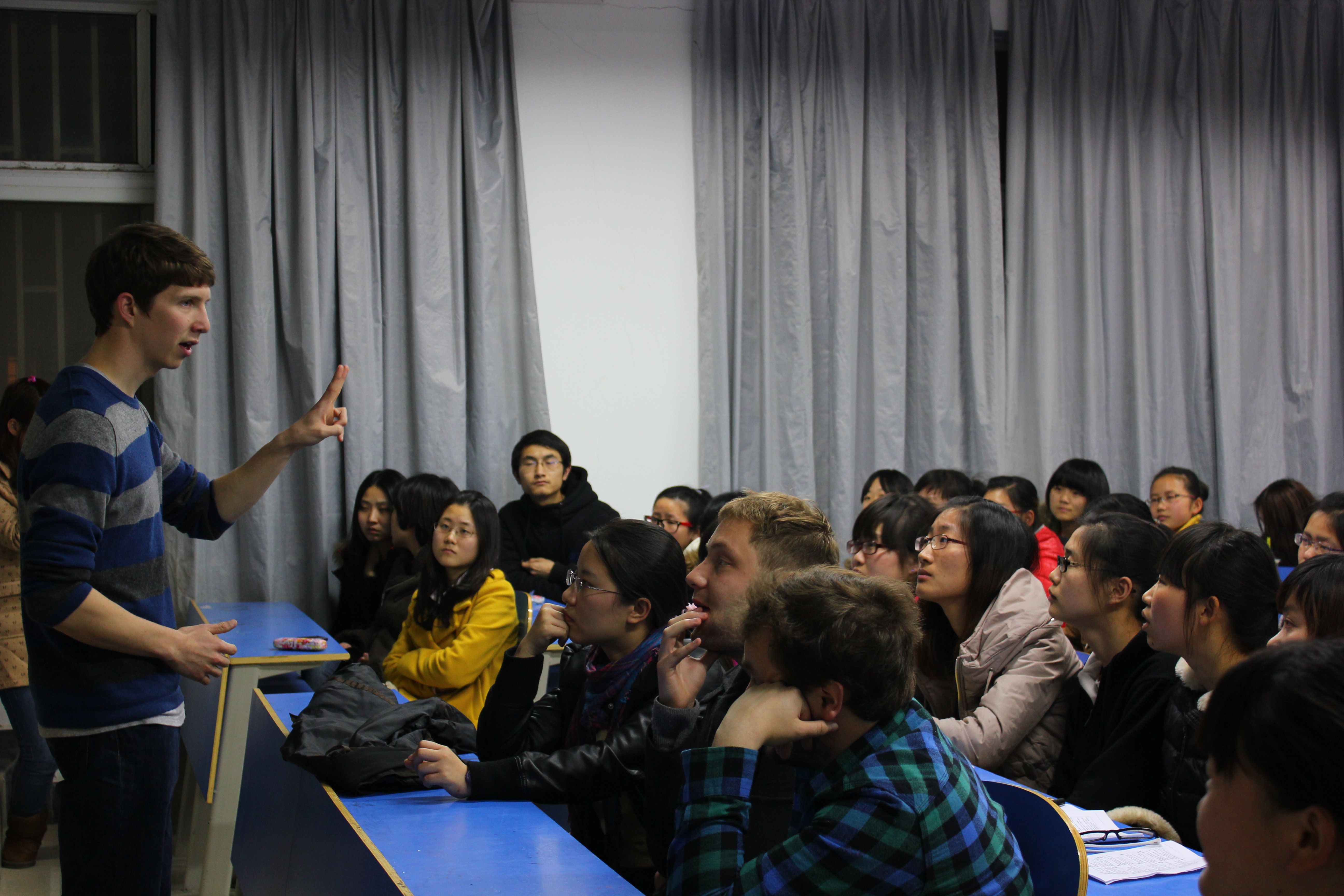 新闻中心讯(记者 刘特)3月26日晚,我校国际合作交流处在外语楼114室举办了三月国际活动月系列活动的最后一场外教讲座,为三月国际活动月画上了圆满的句号。美籍教师Bryan Herbert讲述了他眼里中美文化的对比和对中国的喜爱。 刚到7点,Bryan老师帅气地走上讲台,用有些蹩脚的汉语跟大家问好:"你们好,我是Bryan,中文名字叫林恩,欢迎你们参加我的讲座。"不太标准的口音逗笑了在场的同学。Bryan表示一年半的中文学习还不能让他灵活的使用,汉语对他来说太难了,说着还摆了个鬼脸以示无奈,在场学生忍不住捂着嘴偷笑,现场气氛十分活跃。 "这是我叔叔和婶婶的婚礼。"Bryan在大屏幕上展示自己在家乡的照片,其中有他出席叔叔婚礼的照片。他表示在美国只参加过两次婚礼,戏称在中国则是"Once a month"。Bryan还晒出自己大学期间四处旅游的照片,他说:"我们应该合理安排自己的时间,学习玩耍两不误。" 作为清华大学的交换生,Bryan第一次来到中国,便爱上了这个国家。在中国,他继续着自己的旅行,去峨眉山看乐山大佛、去上海欣赏"东方之珠"、去山东威海度假…… 提问环节中,有一位老师表示想知道Bryan对中国的印象和对在座学生的建议,Bryan回答道:"中国是一 个了不起的国家,我很敬佩中国的文化。对这些学生,我希望他们能够不停追寻自己的梦想,想做就做,不管别人说什么,选择权在自己手里,就像我老师告诉我的--‘no explain, just go’。" 来自经济与商务外语学院的刘启祥同学说:"Bryan老师说的令我觉得受益匪浅。国际合作交流处的这些活动挺有意义的,让我有机会学习和了解更多东西,我会继续关注接下来的活动。"国际合作交流处劳老师表示,4月还会有威斯康辛大学来访和意大利教授的讲座。 ![]() |