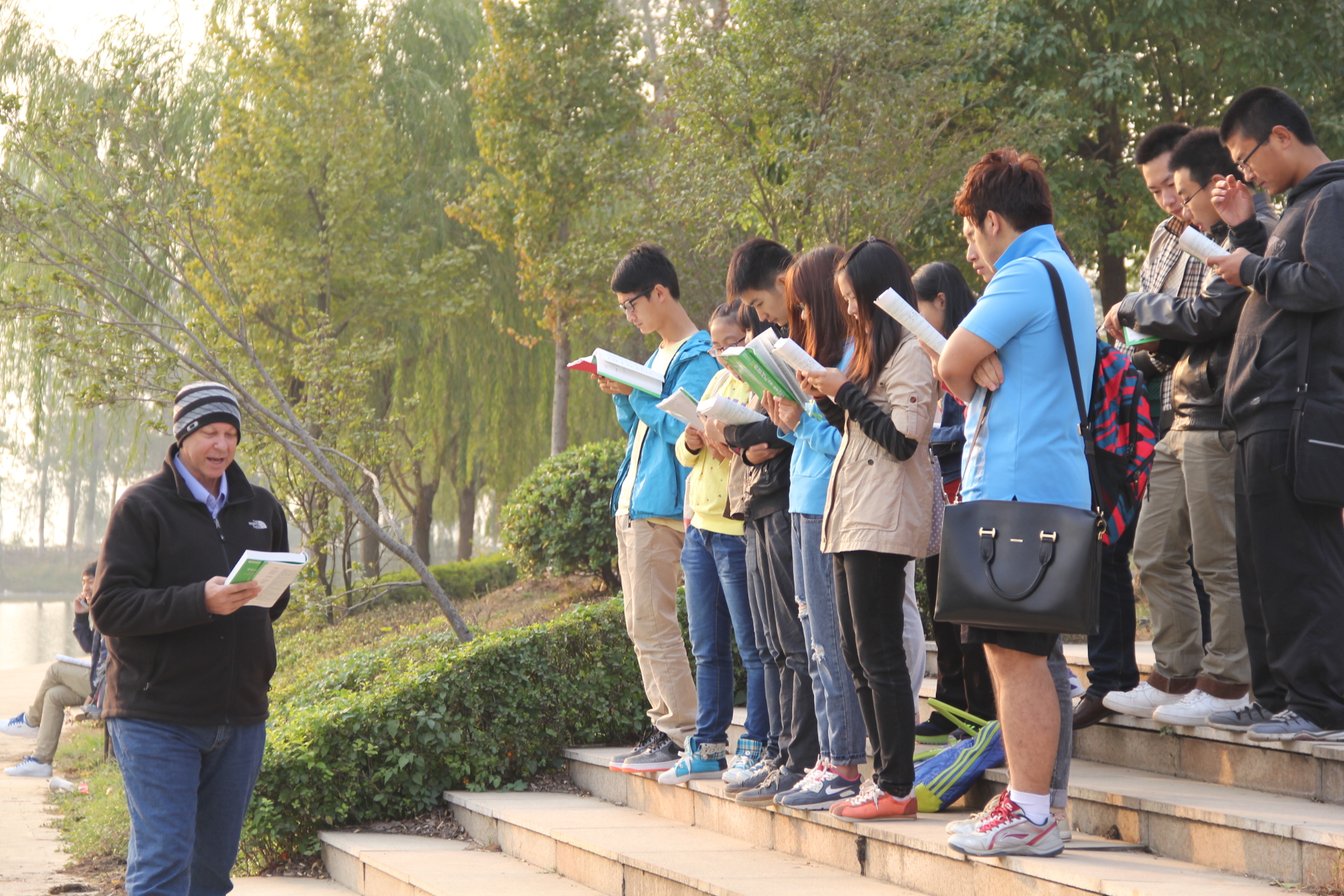 新闻中心讯(记者 魏雨)10月23日,13级国际班同学在国际教育学院办公室开展了一次“特殊”的班会,班会由国际合作交流处副处长马冬玲主持。 “In the past two weeks ,I have learned…….”班会上,学生们都用着不太熟练的英语交流着自己两个星期内的学习感想、疑惑,也有人因为词汇量不够在课堂上口误闹出了不少笑话,在轻松的氛围中,同学们都大胆的用英语表达自己的想法。据国际班学生介绍,他们在过去两个多星期里,每天都有早晚自习,老师会不定时的抽查雅思单词背诵情况,周末也安排了雅思课程。 “我觉得在这两个星期的学习中,我的口语表达能力明显提高了,比起以前也更加自信,现在也敢在别人的面前用英语来表达自己的想法,不再像原来那么胆怯了”,国际班的一个学生说道。课堂上,学生们也踊跃的向马老师提出了一些学习上的问题,她都一一为其解答,并在一些常见问题上给出了具体解决的方法,并安排了专门的老师为其辅导。不少同学都表示,这次的交流让他们对以前一些不懂的问题都豁然开朗。 为了使他们以后的课程越来越完善,马老师也对同学们所提到的雅思老师授课的情况做了详尽的记录。同学们你一句我一句积极地交流着,聊着学习上的问题,语言上的进步,班会在愉悦的气氛中圆满结束。 ![]() 图为外教Lyle带领13级国际班学生早读 |