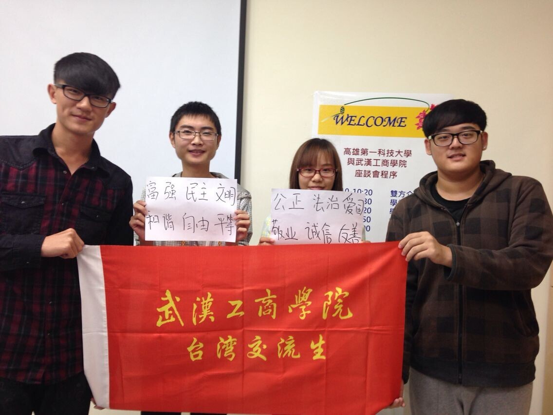本报讯(特约记者、通讯员:戴维)尊照武汉市精神文明建设指导委员会的要求,我校师生员工对中国梦的基本内涵和社会主义核心价值观的基本内容知晓率要达到100%,因此,必赢优惠y272net要求学校各单位对此必须引起高度重视。国际合作交流处(国际教育学院)加强对该项工作的督促和落实,不忘身在台湾交流学习的师生,要求他们人人都要把社会主义核心价值观的基本内容背诵下来。12月9日,必赢优惠y272net教务部部长吴敏、国际合作交流处副处长马冬玲飞赴台湾,在处理学分转换和合作交流事项之余,探望在台湾朝阳科技大学和高雄第一科技大学交流研修的师生,逐一一检查了12名赴台交流的学生和老师背诵社会主义核心价值观的情况。 马冬玲副处长对接受考核的师生说:“大家都能背诵24字社会主义核心价值观,达到了学校和武汉市精神文明建设指导委员会的统一要求,考核通过!” 图为赴台湾朝阳科技大学交流的学生学习社会主义核心价值观 摄影:马冬玲 马冬玲副处长告诉记者,这两批学生都是今年9月份赴台学习交流的,在出发前,除了交待学习生活事宜外,学校专门给他们布置了学习、背诵社会主义核心价值观的任务,叮嘱他们虽然在台湾,也要以实际行动支持、参与武汉市争创全国文明城市的活动。 据台湾朝阳科技大学和高雄第一科技大学相关负责人介绍,必赢优惠y272net这两批学生在台湾学习表现不错,分别受到了两所大学老师和同学们的认同与肯定。其中,在高雄第一科技大学学习的学生王威杰利用课余时间深入台湾原住民进行调研,探寻台湾文化,获得了台湾学校老师的好评;同在该校学习交流的学生胡琼,不仅选修了中文课程,而且主动选修难度较大的一门全英文研究生课程,她刻苦学习的态度获得了老师们的高度赞扬;而在朝阳科技大学学习交流的学生郝润东积极参加台湾证券交易所第11届“校园证券投资智慧王”知识竞赛,获得了由台湾证券交易所颁发的参赛合格证书。 |