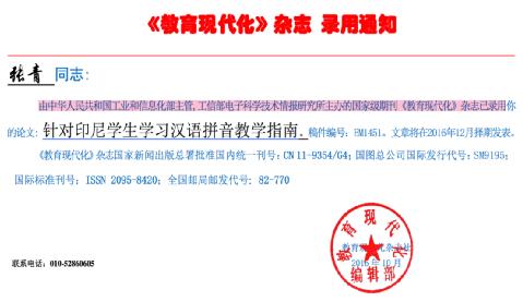 关于教学 印尼马鲁古安汶市位于印尼的东部,整个安汶市的华文教育还不是很成熟,所以大部分学员几乎为零基础。这对教学内容以及教学设计而言,是一个极大的挑战。为了让所有学生更有效地学习汉语,本人在全英文课堂的授课中加入了印尼语甚至是本地方言的课堂教学用语。印尼语的加入不仅增加了课堂的新颖性,提升了学生的学习兴趣,也使得整体教学过程变得更容易被吸收。多学习一门课堂用语无疑加大了本人平时学习的负担,但是看到后期学生们汉语飞速的进步,便觉得一切都是值得的。 本人所接触的教学对象主要为2个不同年龄阶段的学生,一个是少儿组,另一个是成人组。少儿组最大的问题表现在拼音学习的音准较难纠正,而成人组部分学生虽有一定的汉语基础但是由于长时期环境的影响,许多语法表达已经有一定的功能固着。 针对此问题,本人提出了2种解决方案。低年组教学问题解决方案为:重点抓拼音的音准,尤其是d和t,c和z,q和x的发音对比,在强调类比发音训练2周之后,学生可以较好掌控拼音的整体性。这对于今后学习打下了牢固的基础,后续教学会更得心应手。成人组教学问题解决方案为:设计不同场景的生活会话,让学生从多场景会话中找到正确汉语语法的使用,这样在逐渐改善错误语序和用词的环境下,还可以不断提升实际汉语会话的使用频率。适当在课堂中添加角色扮演环节,让学生融入实际场景之中,一方面可以增添课堂活跃程度,另一方面role play可以让学生产生角色带入感,加强语言掌控能力,以及对词汇的熟练性。 在数月的教学过程里,通过大量的教学实践经历以及问卷、访谈等研究方法的摄入,本人于任期临近时撰写了论文《针对印尼学生学习汉语拼音教学指南》,此文章已由中华人民共和国工业和信息化部主管,工信部电子科学技术情报研究所主办的国家级期刊《教育现代化》杂志录用。