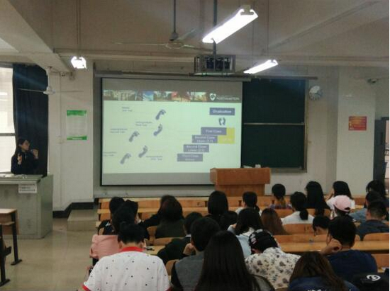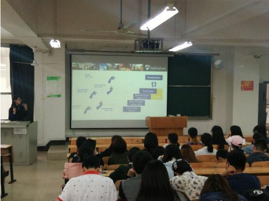 吴倩琳女士还向同学们介绍了如何申请留学北安普顿大学。她介绍,有意愿留学的同学们在出国前需要参加雅思考试并且在通过后递交留学申请材料,还需交纳学费按金和准备签证材料并且申请英国签证。