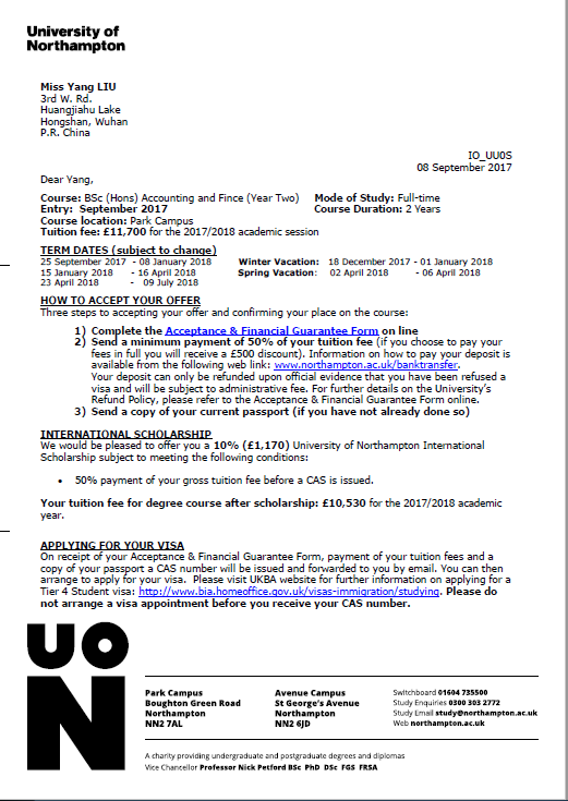 蒋诗意同学获奖学金证书 Written by Jiang Shiyi:蒋诗意同学的来信 I’m very grateful to the university of Northampton and the Wu Han technology and business university because of the opportunity of study abroad in UK. I have been here for two months, and now I know more things about the university of Northampton, it is a good university with great facilities and good environment. In addition, both students and tutors here are very friendly in here. Also, the study atmosphere is pretty good, we are happy to enjoy the lecture. Besides, there is an important section which is student center to provide assistances for student, and they try their best to fix every student’s problems. Furthermore, it was a great experience to have the pre-sessional English EAP, before this, I am confused with some portion in English, however, I now better understand something which is my confused before and academic skills through these lecture in this period. Moreover, I have learned something is interesting and useful, for instance, I now better understand how to catch the main point easier in an article, I have critical thinking chronically now, and when I read articles, I would adjust whether it is reliable or not. I believe that would be helpful in my study life in the future.