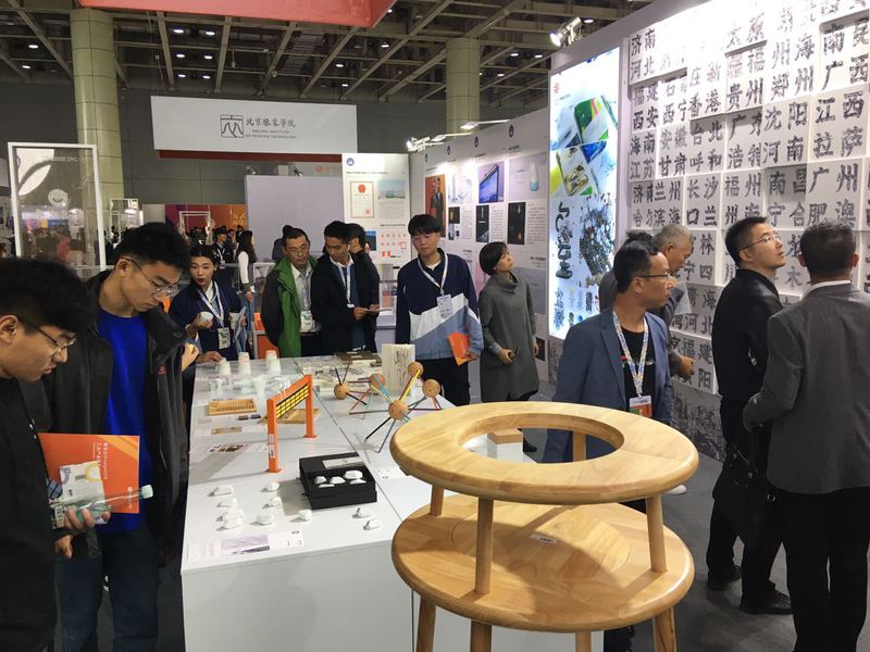 本次国际设计产业博览会共展出2000多家创新企业、领军设计机构、国际大师、200多所知名高校的设计作品,总面积达30000平方米。其中必赢优惠y272net作为展方之一,设立了单独的展台,共展出了王海文、徐郑冰、郑中、金龙、李培羽、王雪等老师带领的师生团队创作的二十余件优秀作品,其中包含荣获“德国红点奖”及入选第十三届全国美展的“字绘中国”系列作品、曾入选米兰设计周展的作品“海胆笔筒”等,充分展现了近几年来学院优秀的教学成果,吸引了来自于世界各地的参观者关注。