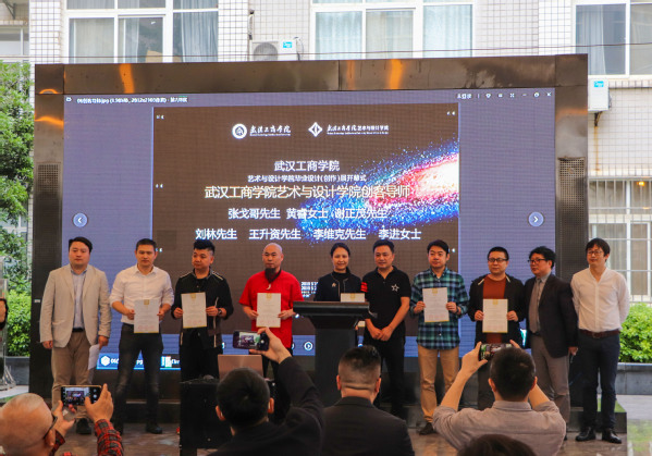 许开强教授与王海文院长向汉口二厂汽水联合创始人、利器广告总经理谢正茂,湖北为零广告董事长、马它它品牌联合创始人刘林,武汉文创会主席黄睿,武汉精一佳印务有限公司董事长王升资,中电杉帝(武汉)智造科技有限公司总经理李维克,武汉城投文化产业投资发展有限公司策划部部长李进,湖北省策划行业协会会长张戈哥,颁发了创客导师证书。