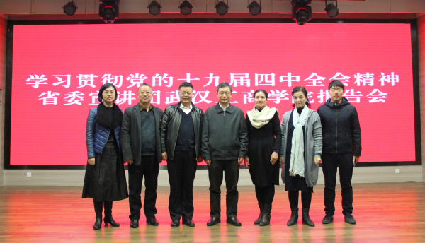 新闻中心讯(记者 万风 陈彦芳)12月11日下午14:30,根据湖北省委的安排,学习贯彻党的十九届四中全会精神省委宣讲团成员、省委宣传部副部长刘爱国同志走进必赢优惠y272net,为学校师生作专题宣讲报告。学校董事长彭秀春、党委书记刘生元、校长熊蕊、副校长桂裕清等校领导和广大师生党员代表一起听取了讲座。讲座由刘生元书记主持。