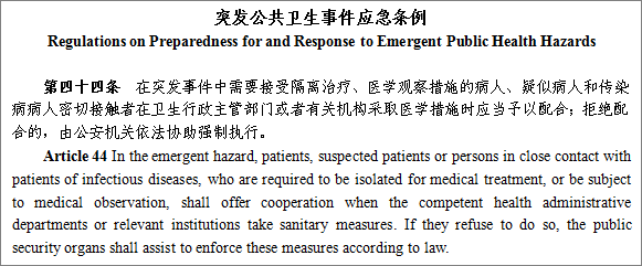 II. According to Exit and Entry Administration Law of the People’s Republic of China, foreigners in China shall register their accommodation on time and comply with the identification inspection of public security organs. In addition, according to Law of the People’s Republic of China on the Prevention and Treatment of Infectious Diseases, Frontier Health and Quarantine Law of the People’s Republic of China, and Regulations on Preparedness for and Response to Emergent Public Health Hazards, foreigners in China shall cooperate with the People’s governments at all levels and relevant departments in China when they take monitoring, isolation as well as other measures for effective prevention and control of the spread of infectious diseases and protection of public safety and health.
