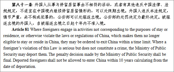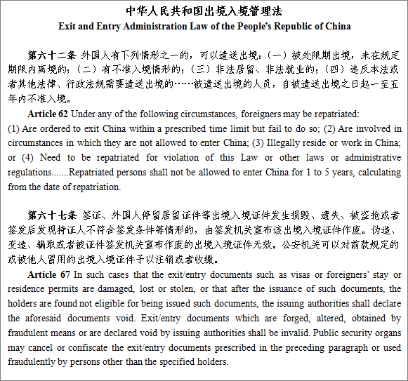 IV. According to Exit and Entry Administration Law of the People’s Republic of China, where foreigners violate the laws or regulations of China, the public security organ shall make decisions including invalidating, canceling or confiscating their visa or other documents, ordering them to exit China within a time limit, repatriating or deporting them according to their violation circumstances. Repatriated foreigners shall not be allowed to enter China for one to five years, calculating from the date of repatriation. Deported foreigners shall not be allowed to enter China within 10 years calculating from the date of deportation.