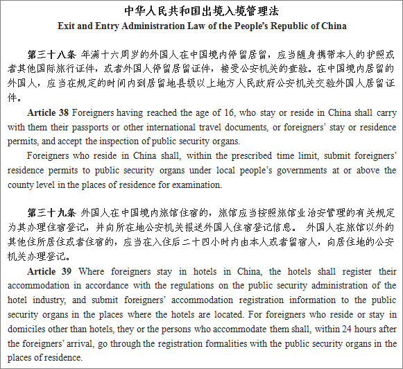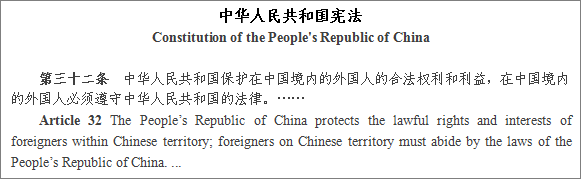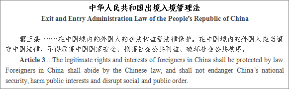 I. According to Constitution of the People's Republic of China and Exit and Entry Administration Law of the People's Republic of China, the legitimate rights and interests of foreigners in China shall be protected by laws. Foreigners in China shall abide by the Chinese laws, and shall not endanger China’s national security, harm public interests and disrupt social and public order.
