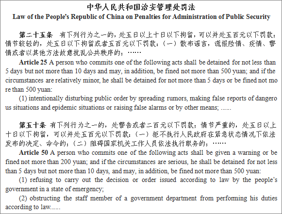 III. According to Law of the People’s Republic of China on Penalties for Administration of Public Security and Criminal Law of the People’s Republic of China, whoever refuses health quarantine measures such as health declaration, temperature check, epidemiological investigation and collection of samples, or refuses health treatment measures such as isolation, inspection, local treatment and transfer to other hospitals for treatment shall be held accountable in accordance with law and penalized with a warning, a fine or detention. Wherever a crime is constituted, criminal liabilities shall be investigated in accordance with law.
