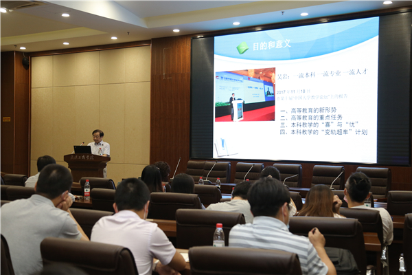 “一所成熟的大学、一个有定力的校长和党委书记、一位有情怀的教师,应该时时把本科教学捧在手里、抱在怀里、扛在肩上、顶在头顶。”吴教授根据教育部高教司司长吴岩在第十届“中国大学教学论坛”上题为《一流本科、一流专业、培养一流人才》的报告精神,向大家强调了一流专业建设的重要性。他还根据《教育部办公厅关于实施一流本科专业建设“双万计划”的通知》文件精神的要求,就一流本科专业建设点的建设原则、报送条件等内容做了详尽的分析与解读,并结合武昌首义学院的实际情况,向大家重点分享了该校如何着力推进与企业合作办学、合作育人、合作就业、合作发展;坚持学生中心、产出导向、持续改进的基本理念,推进OBE模式教育教学改革;积极推进新工科建设等方面的经验。