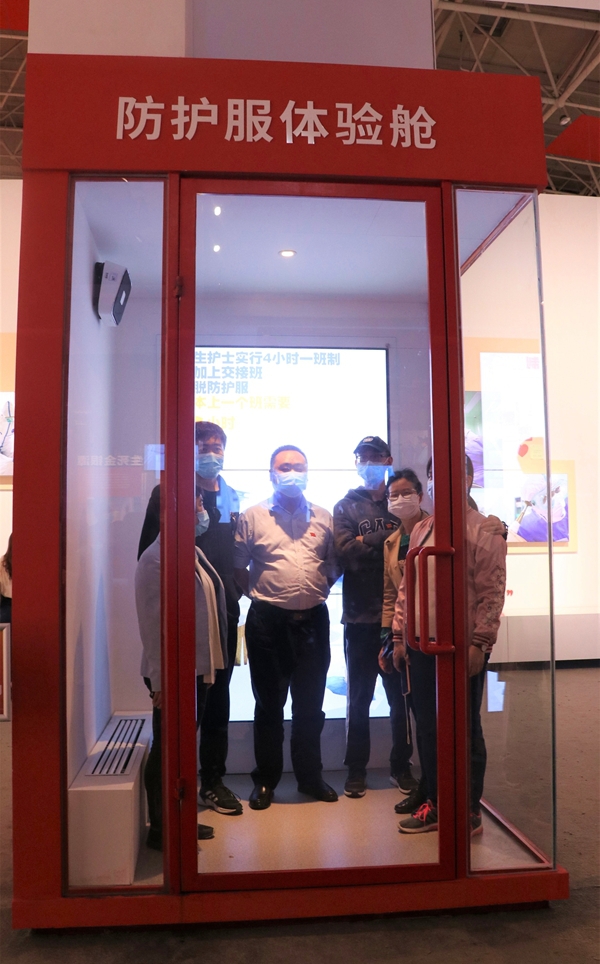 观看以武汉抗疫一线医务人员在ICU病房救治患者的故事为原型的全息幻影场景;在防护服体验舱体验白衣战士穿防护服的感受;参观方舱医院的实景展区;为牺牲了的抗疫烈士献花;数一遍援汉医疗队的队旗;一览“基建狂魔”以“中国速度”建医院……展览的多个地方都让两位大学生饱含热泪。