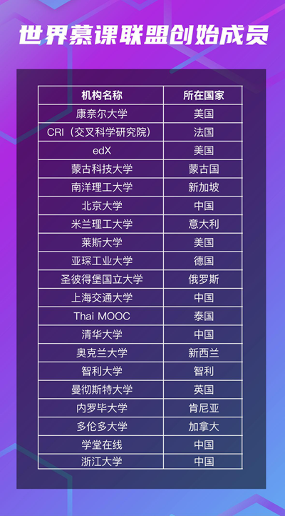 会上,世界慕课联盟在大会正式发布成立,清华大学担任联盟首届主席单位,清华大学校长邱勇担任联盟创始主席。学堂在线等3家在线教育机构及来自六大洲14个国家的17所大学成为创始成员。