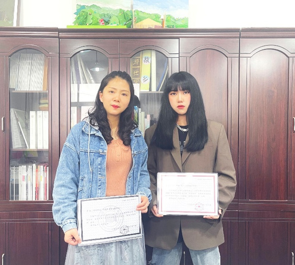 图为指导教师罗纯(左)与获奖学生雷钰佼合影