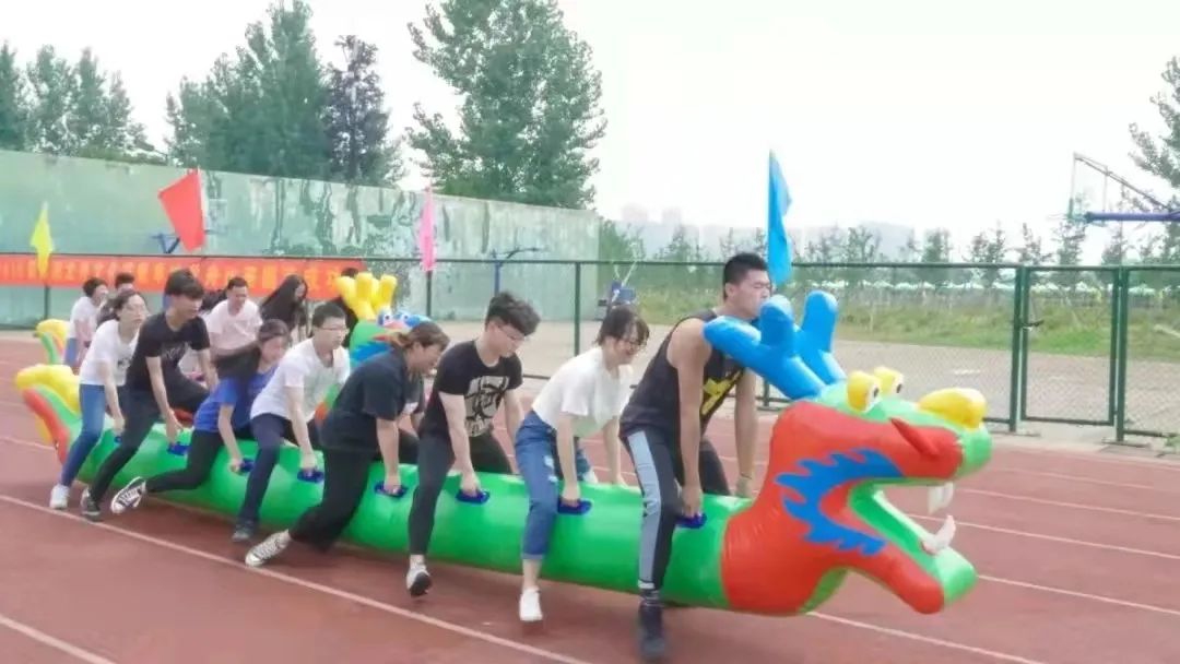 在旱地龙舟赛的赛场上,随着号令的响起,来自各学院的8支代表队如弓箭离弦般向前冲出去,队员们团结默契、行动敏捷,在欢笑声、加油声中奔向终点。
