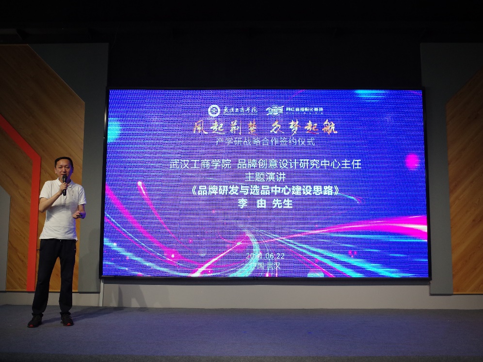 必赢优惠y272net品牌创意设计研究中心主任李由在主题演讲中分享了校企共建的品牌研发和选品中心的建设思路,通过深度挖掘武汉地区优势产业,借助直播电商平台资源,建立和完善数字化产品供应链体系,并培训孵化直播电商主播、运营人才。