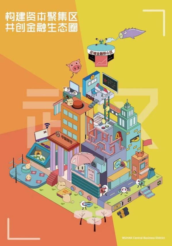 在设计的过程中,为了展现金融城的聚集和丰富,学生钟先伟在教师肖雪韵的指导下,运用2.5d的方式将西北湖的美景融入其中。此外,还在样式的模型中进行了其它物改造,使其和金融办公的素材相融合,同时放大部分的金融工具,引入“拟人”的招财猫、金豆子等,充分展现了金融城的活力。