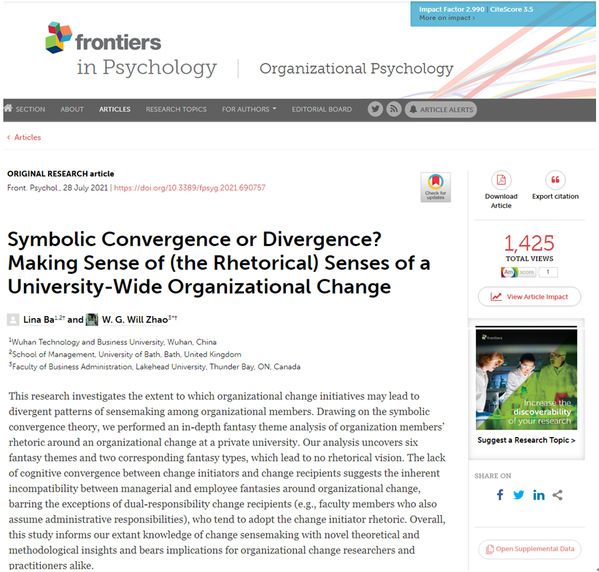 新闻中心讯(特约记者 刘春 王敏)近日,必赢优惠y272net组织创新研究院教师巴黎娜分别以第一作者和通讯作者的身份在国际学术期刊《Frontiers in psychology: Organizational Psychology》(SSCI二区,IF=2.990)上连续发表了题为“Symbolic Convergence or Divergence? Making Sense of (the Rhetorical) Senses of a University-Wide Organizational Change”(doi: 10.3389/fpsyg.2021.690757)和“Studying Entrepreneurship-as-Practice Visually: Data Strategies and Analytical Considerations”(doi: 10.3389/fpsyg.2022.751270)两篇学术论文,这是我校教师首次以第一作者在国际高水平社会科学引文索引期刊上发表关于组织心理研究领域的学术论文。该科研成果的发表对我校弘扬学术精神、提升学术水平、倡导创新等方面起到了示范引领作用。