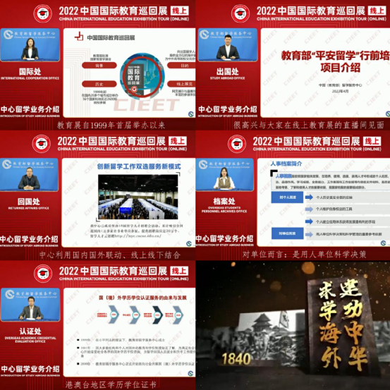 中心程家财主任在线致欢迎辞,为本届线上教育展揭开帷幕。直播期间,中心直播间开展留学服务系列讲座,分享有关留学人员档案存档、出国留学行前培训、留学回国人员就业落户派遣、国(境)外学历学位认证、国际教育项目等业务信息,回应社会关切、提供权威建议。中心直播间首次推出《求学海外、建功中华——留学百年》专题宣传片,讲述我国一代代莘莘学子勤勉学习、为国图强的生动故事,引导广大留学人员将个人留学梦融入中华民族伟大复兴的“中国梦”,涵养家国情怀、砥砺强国之志。