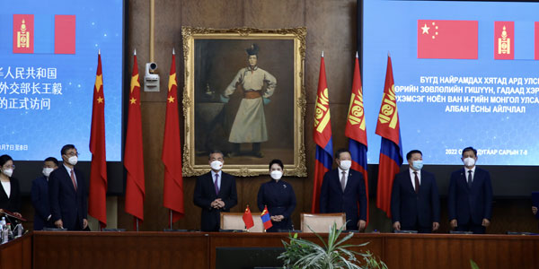 王毅表示,中蒙是山水相连的好邻居、相互信赖的好朋友、相互支持的好伙伴。中方始终将中蒙关系作为周边合作的首要方向之一。在两国领导人战略引领下,中蒙全面战略伙伴关系得到巩固深化,不断迈上新台阶。两国团结抗疫,“羊来茶往”的佳话谱写了两国友好的新篇章。中方赞赏蒙方理解支持中方的正当主张,支持蒙实现政治稳定、社会和谐,走符合自身国情的发展道路,朝着“新复兴政策”愿景大踏步前行,将继续坚定支持彼此维护好核心利益。
