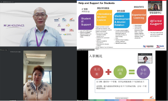 在工作交流环节中,新加坡卫生部控股公司医疗人力部副主任阮仲文、新加坡南洋理工学院健康与社会科学系主任陈飞雁、义安理工学院卫生健康学院助理院长李文婕、新加坡保健服务集团护理部副主任林红珠围绕会议主题,分享了项目培育学生成才成长的制度性安排、院校人才培养体系和教育教学特色、就业后在职培训及学历晋升渠道等重要内容,回应了学生和家长广泛关注的各类问题。来自湖北职业技术院校、目前正在义安理工学院就读大学三年级的支欣如同学,作为优秀项目学生代表,分享了在新学习和生活的有关情况和心得感想。