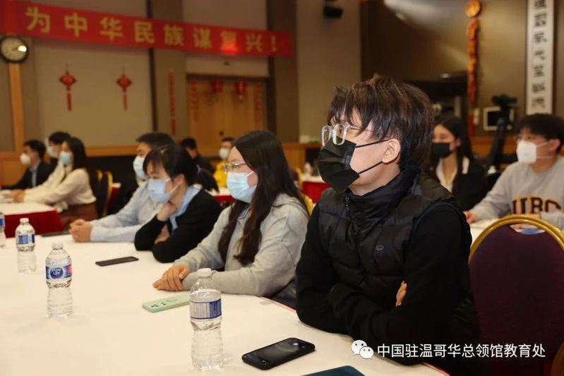 杨总领事向与会留学生介绍了党的二十大胜利召开的情况,并表示面对当今时代的挑战和机遇,新时代海外留学青年肩负着实现中华民族伟大复兴和第二个百年奋斗目标的历史重任。最后,杨总领事提出殷切期望,希望领区广大留学生热爱祖国,树立远大理想,交流互鉴,做中加友好交往的使者,刻苦学习,立志早日成才,并叮嘱继续做好个人疫情防护。