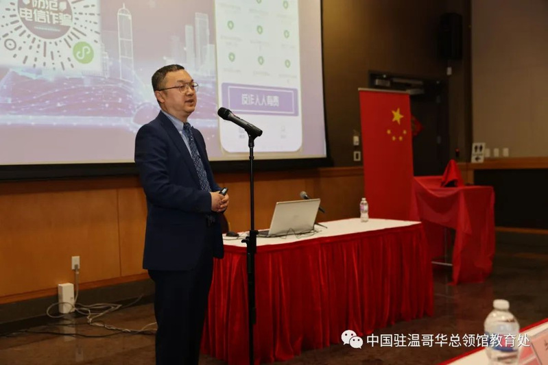 驻温哥华总领馆近日举办平安留学宣传活动。活动以线下举办、线上直播的方式同步进行。活动期间,总领馆发布反诈接龙小程序并举办平安留学和领事保护系列讲座。杨舒总领事出席活动并致辞,郭军参赞介绍反诈接龙小程序功能,领区中国留学生代表参加活动并同总领馆相关领事和讲座专家进行交流。