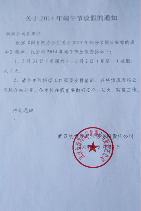 2014年端午放假通知